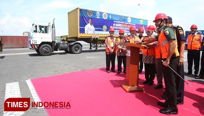 TIMES Tarakan/Gubernur Jawa Timur. Dra. Hj. Khofifah Indar Parawansa saat melepas ekspor komoditi pertanian di Terminal PetikEmas Surabaya (TPS). Kamis (21/3/2019). (FOTO: TIM Media For TIMES Indonesia)