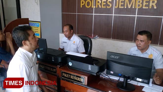 TIMES Tarakan/Wakil Ketua Bidang Litbang dan IT DPD Partai Perindo Kebupaten Jember, Ahmad One Prastiono saat melaporkan Ketua DPD Partai Perindo Kabupaten Jember Hanung Prijobodo ke Polres Jember, Senin (6/5/2019). (FOTO: Dody Bayu/TIMES Indonesia)